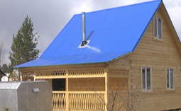 Когда силовой каркас этого деревянного дома, площадью больше двухсот квадратных метров, был уже готов на 98 процентов, будущие хозяева решили внести изменения в конструктив. Проект был рассчитан на мягкую европейскую погоду. Модная нынче двухскатная с одним коротким крылом крыша хоть и была запроектирована под наклоном для сдувания снеговых хлопьев, но угол был небольшой. Между тем, панорамные окна, очень дорогие по стоимости, заставили хозяина еще раз просчитать нагрузку на кровлю.