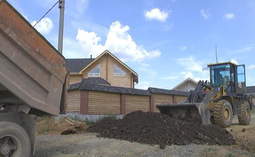 Самосвалы один за другим заезжают на площадку. Поблескивая на солнце боковыми зеркалами, экскаватор загружает полный борт грунта. Ведутся работы по выравниванию поверхности. Этот участок в коттеджном поселке запланирован под инфраструктуру.