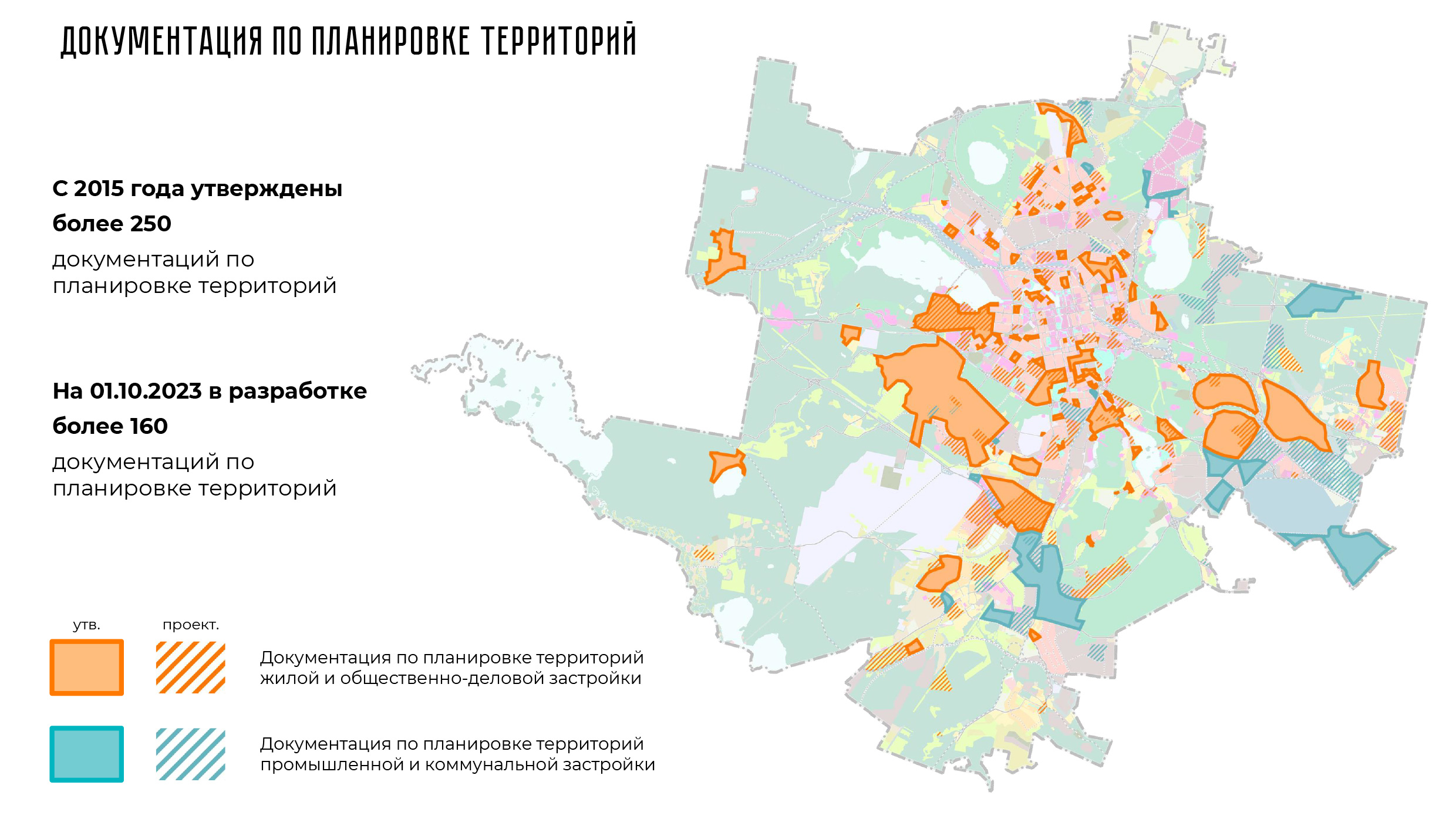 Начальник МБУ «Мастерская Генерального плана» Павел Скачков рассказал о современных подходах к территориальному планированию и показал карту, на которой обозначены площадки, в отношении которых разрабатывается документация планировке территорий, в том числе под новую жилую и промышленную застройку.