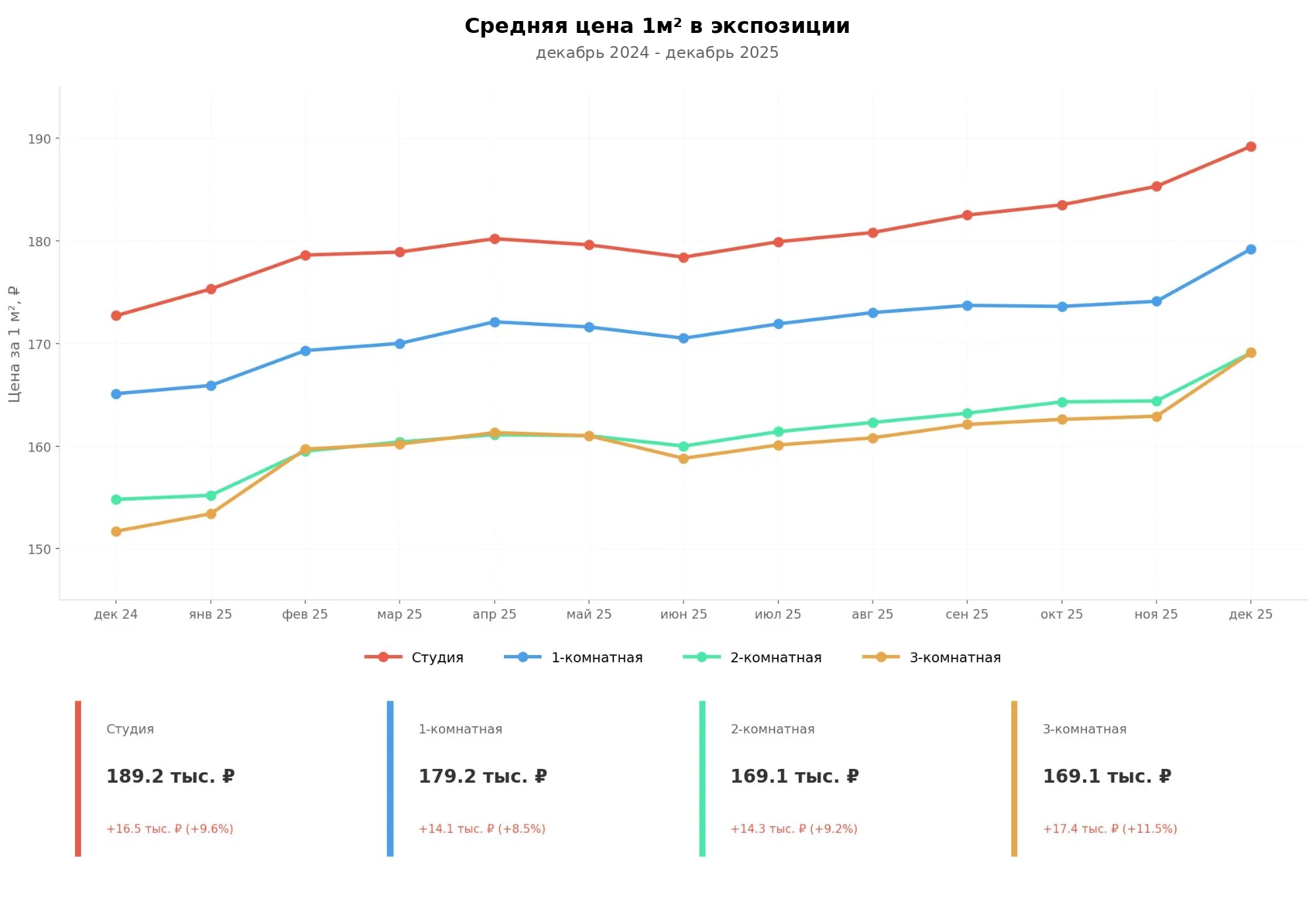 За год, с декабря 2024 по декабрь 2025, квартиры в новостройках Екатеринбурга подорожали на 9-11% в зависимости от типа. Больше всего выросли трёшки — на 11,5% до 169,1 тыс. ₽ за м². Студии прибавили 9,6% и достигли 189,2 тыс. ₽ за м². Однокомнатные и двухкомнатные квартиры подорожали на 8,5% и 9,2% соответственно.