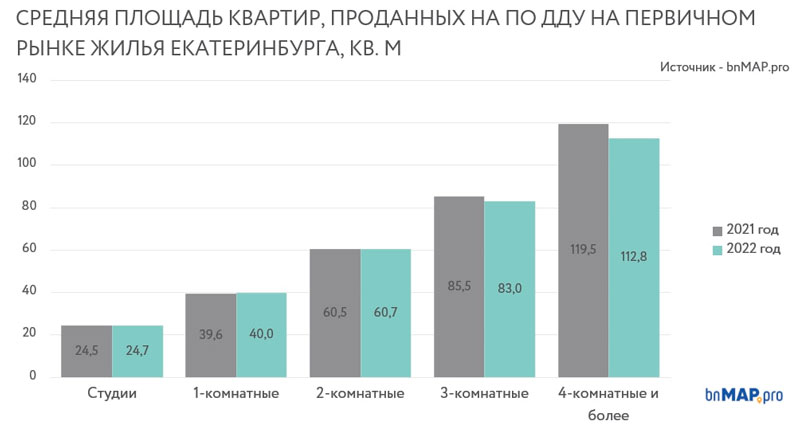 Как отмечает партнёр проекта bnMAP.pro по Екатеринбургу, руководитель аналитического отдела УПН Михаил Хорьков, в структуре сделок (по количеству квартир) 2022 года почти 60% занимают студии и однушки. Но для девелопера важнее не количество проданных квартир. а реализованная площадь. И в данном разрезе ситуация выглядит иначе. Доля студий в объеме реализации занимает лишь 10%, а однокомнатных – 33%. Основной продукт на первичном рынке жилья – квартиры с двумя спальнями. Их доля в объеме продаж 2022 года – 35%.