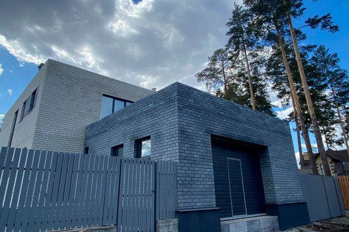 Коттедж возведён из твинблока, фасады – из декоративного серого кирпича. Особенность проекта – открытая терраса на крыше «первого уровня» дома. На первом этаже новостройки имеются кухня-столовая-гостиная площадью более 40 кв. м, гараж, мастерская, санузел и гардеробная. На втором этаже – три спальни, в том числе одна мастер-спальня с гардеробной и собственным санузлом. Здесь же выход на открытую террасу. На этаже есть дополнительные санузел и гардеробная.
