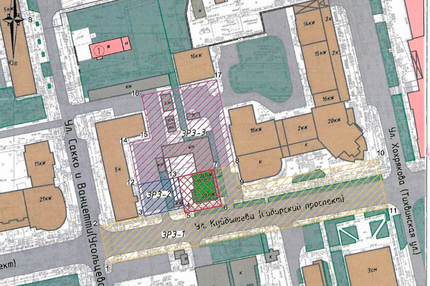 Помимо непосредственно зоны охраны объект получил несколько зон регулирования застройки (ЗРЗ). В том числе территорию около 27 соток занимает ЗРЗ-2, в которой разрешается возведение капитальных объектов высотой до 16 метров (фактически до пяти этажей). Часть зоны ЗРЗ-3 уже застроена. Здесь есть несколько хозяйственных построек, не имеющих исторической ценности. Пустующая земля используется под парковку. Часть ЗРЗ-2 находится в ведомстве Ленинского райотдела полиции, часть — на придомовой территории высоток на ул.Куйбышева, 31 и ул. Хохрякова, 74.