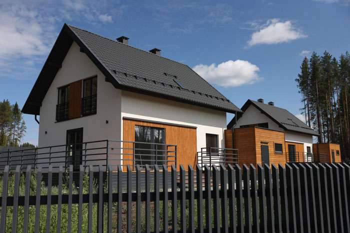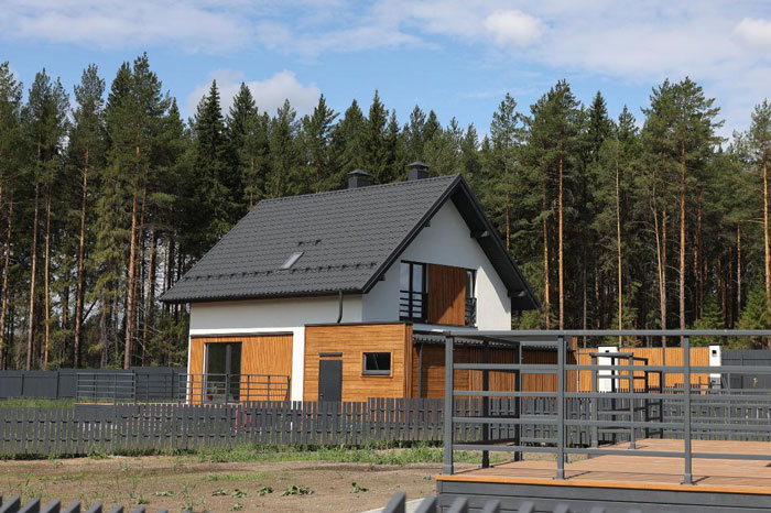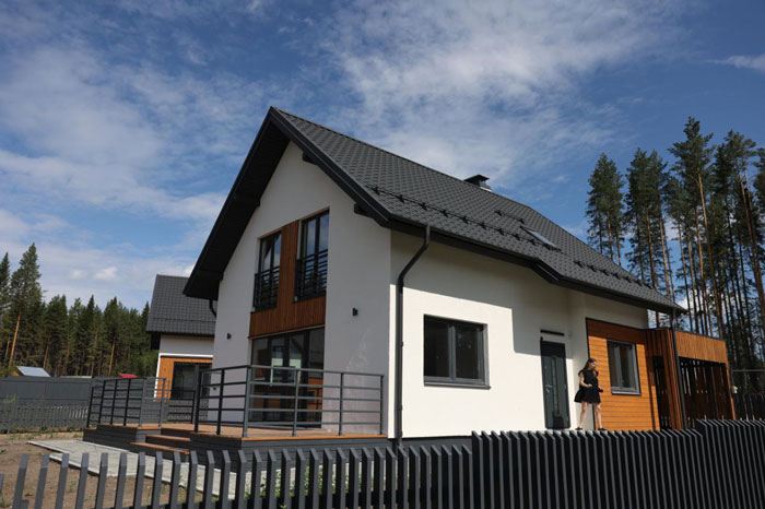 Облик посёлка не должен потерять актуальность в ближайшие 10-20 лет. Девелопер предлагает пять базовых проектов коттеджей площадью от 93 до 169 кв. м. Плюс десять опциональных решений. Все постройки выполняются в едином стиле, но можно выбрать коттедж с плоской либо со скатной кровлей. В отделке фасадов применяется классическое сочетание трёх фактур и трёх цветов – деревянный планкинг, крупноформатный керамогранит и однотонная фактурная штукатурка.