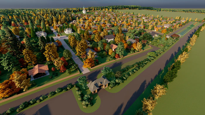 В посёлке предусмотрено строительство школы, детсада, спортзала, храма, магазина, организация парка и водоема. Это будет многофункциональный водный объект. Он сможет выполнять противопожарные функции, служить местом отдыха, а зимой превращаться в каток. Предполагается зарыбление водоёма.