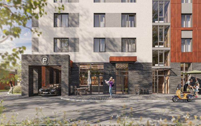 На первом этаже будут размещаться помещения под офисы, предусмотрены дизайнерский холл с игровой зоной, гостевой санузел, лапомойка, сервисный холл (для транспортировки мебели и строительных материалов). Двор будет зонирован по возрастам и активностям: для детей – детская площадка, для взрослых – лаунж-зона, для спортсменов – зона воркаута.