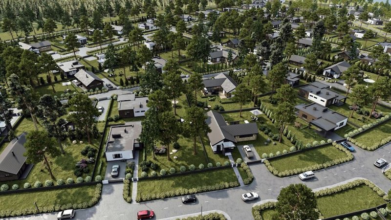 Облик посёлка не должен потерять актуальность в ближайшие 10-20 лет. Девелопер предлагает пять базовых проектов коттеджей площадью от 93 до 169 кв. м. Плюс десять опциональных решений. Все постройки выполняются в едином стиле, но можно выбрать коттедж с плоской либо со скатной кровлей. В отделке фасадов применяется классическое сочетание трёх фактур и трёх цветов – деревянный планкинг, крупноформатный керамогранит и однотонная фактурная штукатурка.