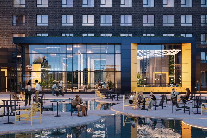 Большое внимание проектировщики уделили дворовой территории площадью в четыре футбольных поля. Главной доминантой двора должен стать холм высотой 9 метров. Он сформирует пространство для активных игр. В равнинной части двора будет построена система искусственных водоёмов и пруд у атриума. Зимой он сможет превращаться в каток.