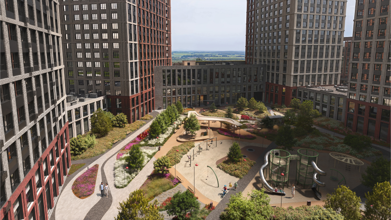 Внутренний двор, единый для всех домов, расположится на стилобате – на крыше паркинга.