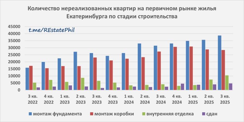 За третий квартал 2025 года объем нераспроданного жилья на первичном рынке столицы Урала увеличился на 9,6% по сравнению со вторым кварталом 2025 года и на 27,4% по сравнению с третьим кварталом 2024 года. Такие данные приводит независимый аналитик рынка недвижимости Сергей Меньшенин (Екатеринбург).