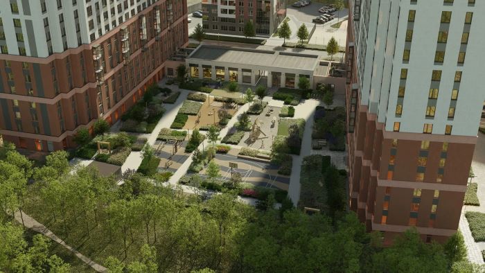Между домами будет организован общий двор с детскими и спортивными площадками. С внешней стороны – бесплатный наземный паркинг с видеонаблюдением. Ещё одна особенность квартала – сад с клёнами, можжевельником и ирисами.