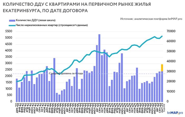 В октябре 2025 года на рынке новостроек Екатеринбурга по данным аналитической платформы bnMAP.pro было зарегистрировано около 2,85 тыс. договоров долевого участия в строительстве (ДДУ). Это на 33% больше, чем в сентябре.