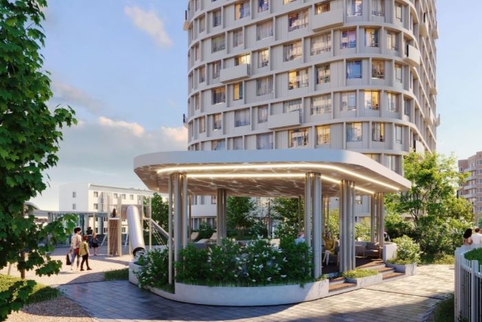 В составе жилого комплекса три высотных секции (две по 29 этажей и одна – 23 этажа) на общем одноэтажном стилобате, на крыше которого – общий двор. Сам двор решено выполнить в курортном стиле, приметы которого – патио с водопадом и сады-клумбы с преобладанием белых цветов. Во внешнем контуре стилобата – коммерческие помещения, в его основном объёме – паркинг. Плюс паркинг на двух подземных этажах. Суммарно – 275 машино-мест. На трёх нижних этажах одной из башен – помещения под детский сад на 75 малышей.