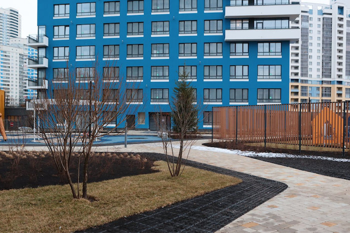 В жилом комплексе предусмотрен подземный паркинг, во дворе воркаут-площадки, игровые зоны для детей различных возрастов, беседки, дорожки для пеших прогулок. Предусмотрена релакс-зона с шезлонгами и зонтиками. Среди необычных решений, применённых в благоустройстве двора, – паровой камин и система туманообразования.