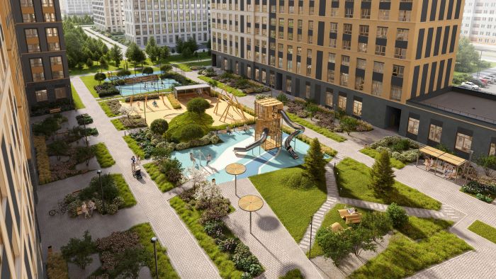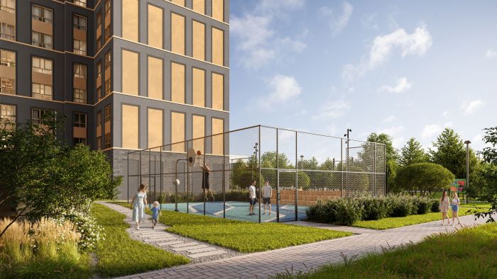 Секции дома формируют замкнутое дворовое пространство, где будут организованы спортплощадка с резиновым покрытием и трибуной игровые зоны по возрастам, воркаут-площадки, запроектированы перголы, игровой комплекс «Йети» из натуральных материалов.