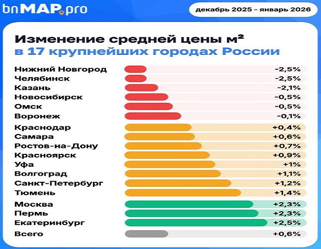 Аналитики системы мониторинга и анализа новостроек bnMAP.pro посчитали динамику цен на квартиры в новостройках в 17 крупнейших городах России в январе 2026 года. Оказалось, что за один месяц наступившего года в шести российских мегаполисах средняя цена квадратного метра первички снизилась, а в одиннадцати – выросла.