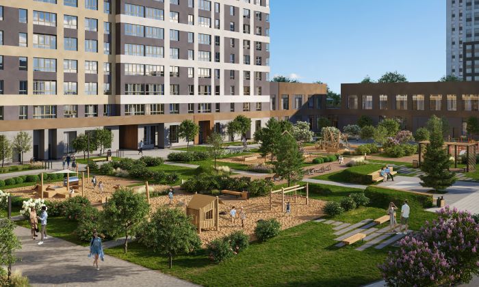 Дворовое пространство будет выполнено в эко-стиле. Здесь найдётся место для воркаут-площадки, зон для отдыха детей и взрослых.