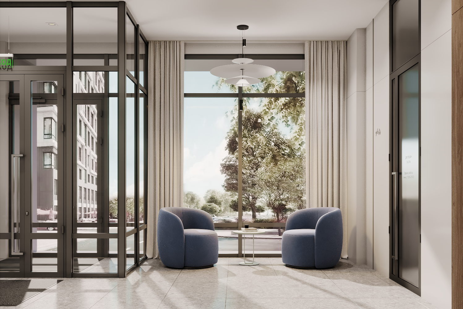 Функционал коммерческих помещений продумывается еще на этапе проектирования и четко соблюдается при вводе в эксплуатацию. Жителей и гостей экосистемы встречает центральное просторное лобби — сочетание комфорта и функциональности.
