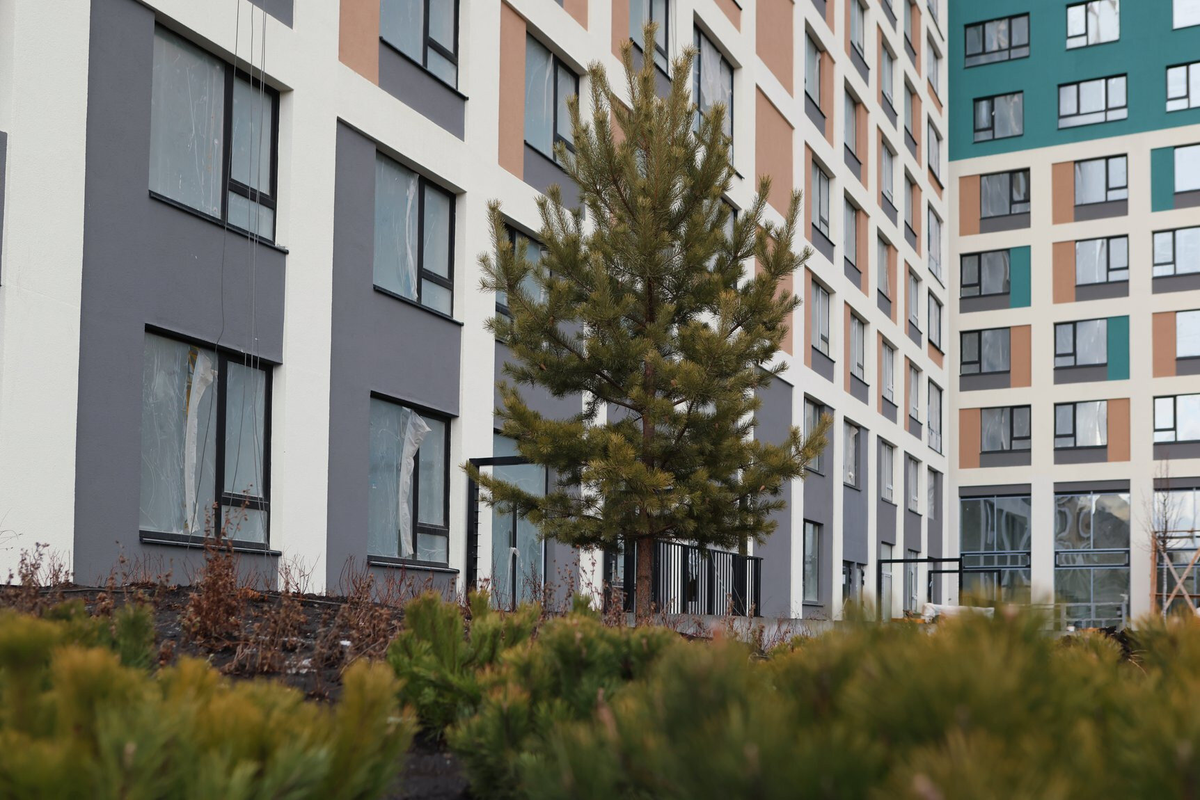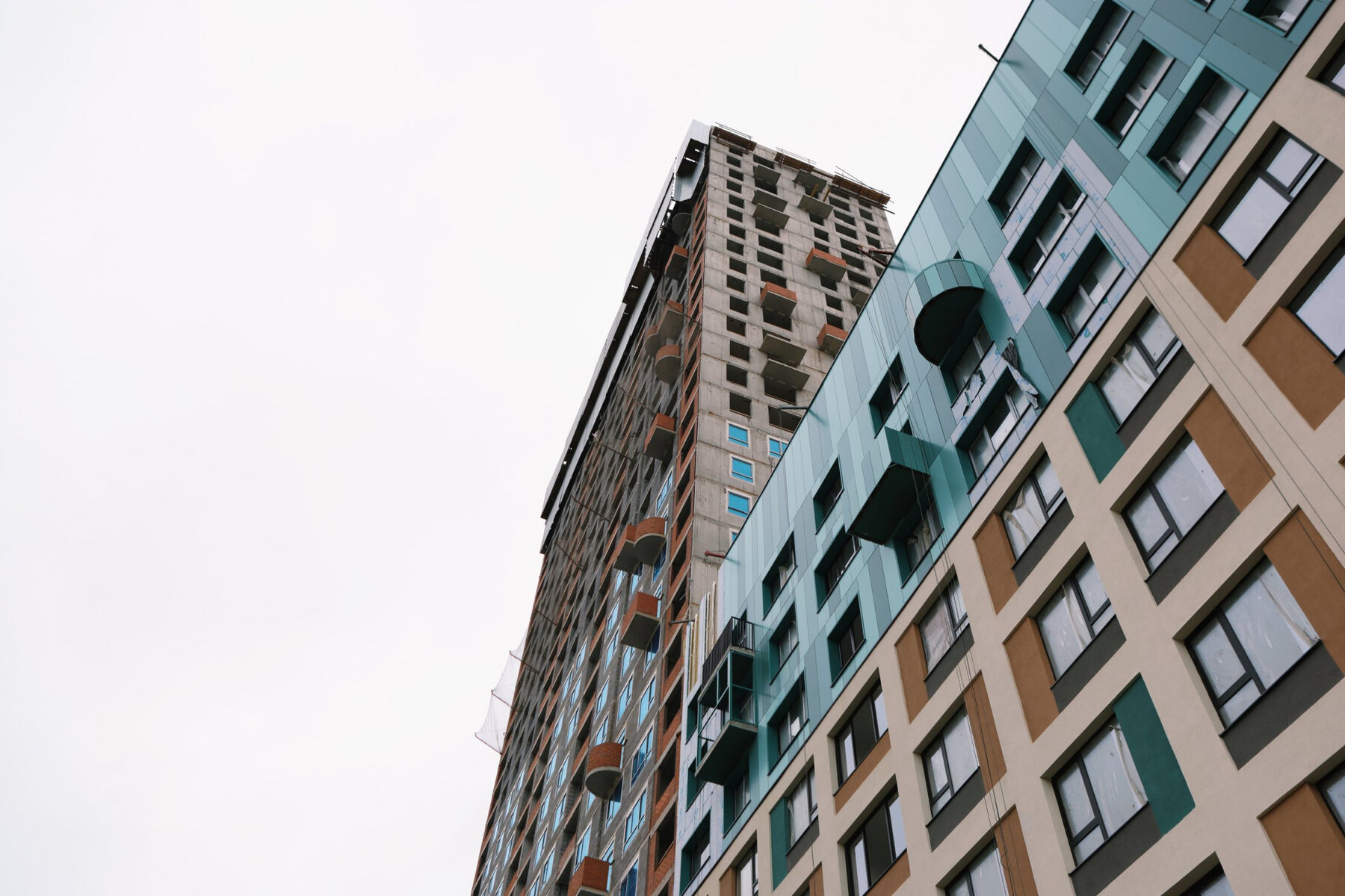 - ведутся работы по монтажу навесного фасада - облицовка французских балконов