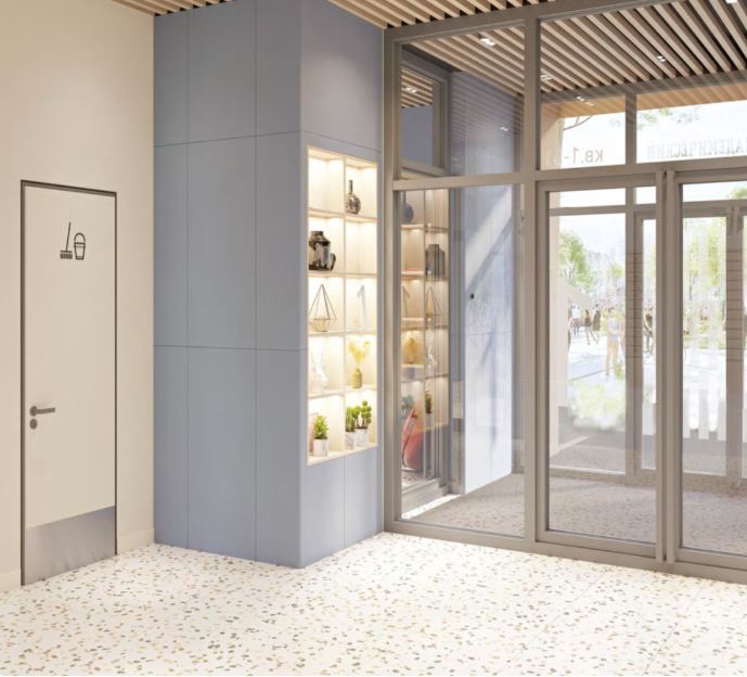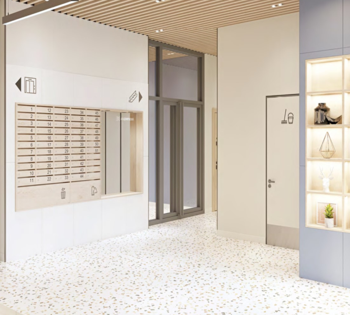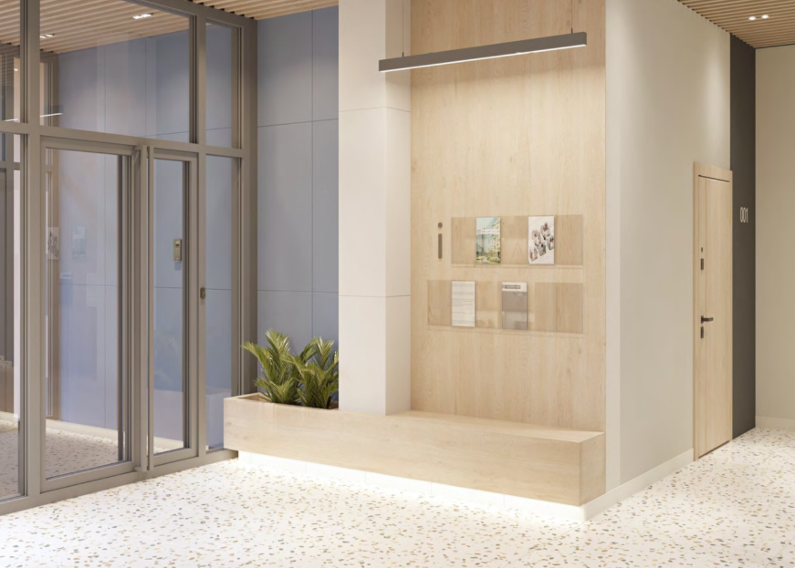 В домах спроектированы панорамные входные группы, без ступеней, на уровне земли. Холлы первого этажа сквозные.