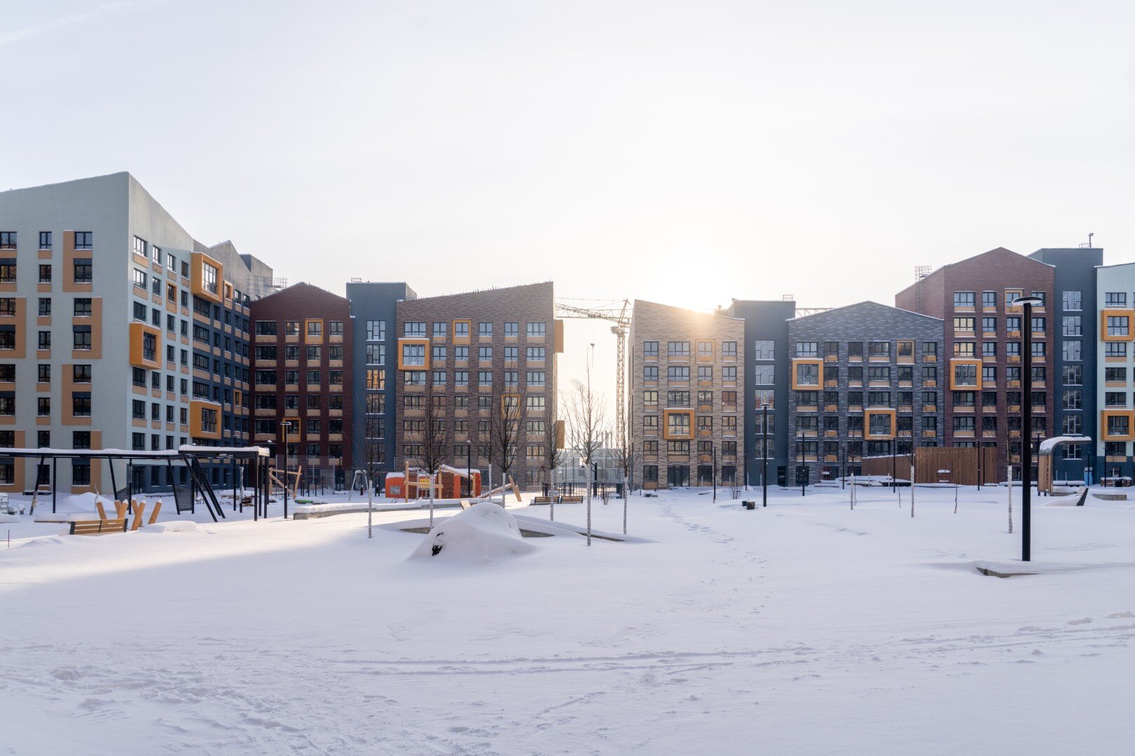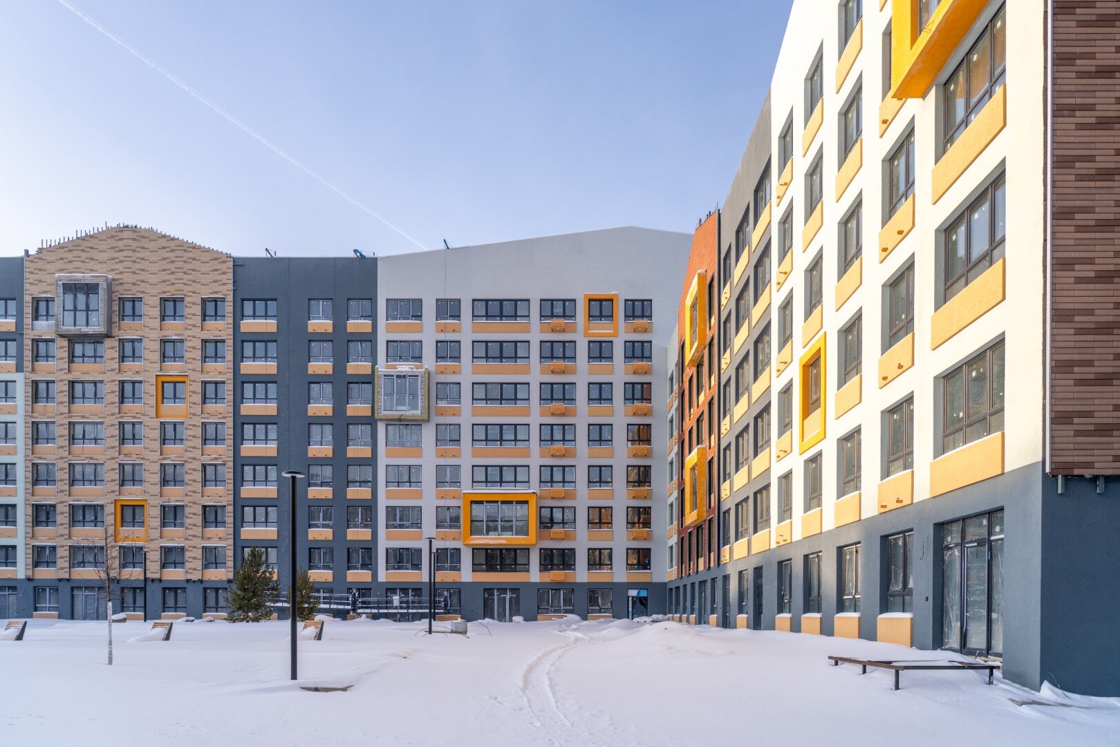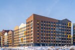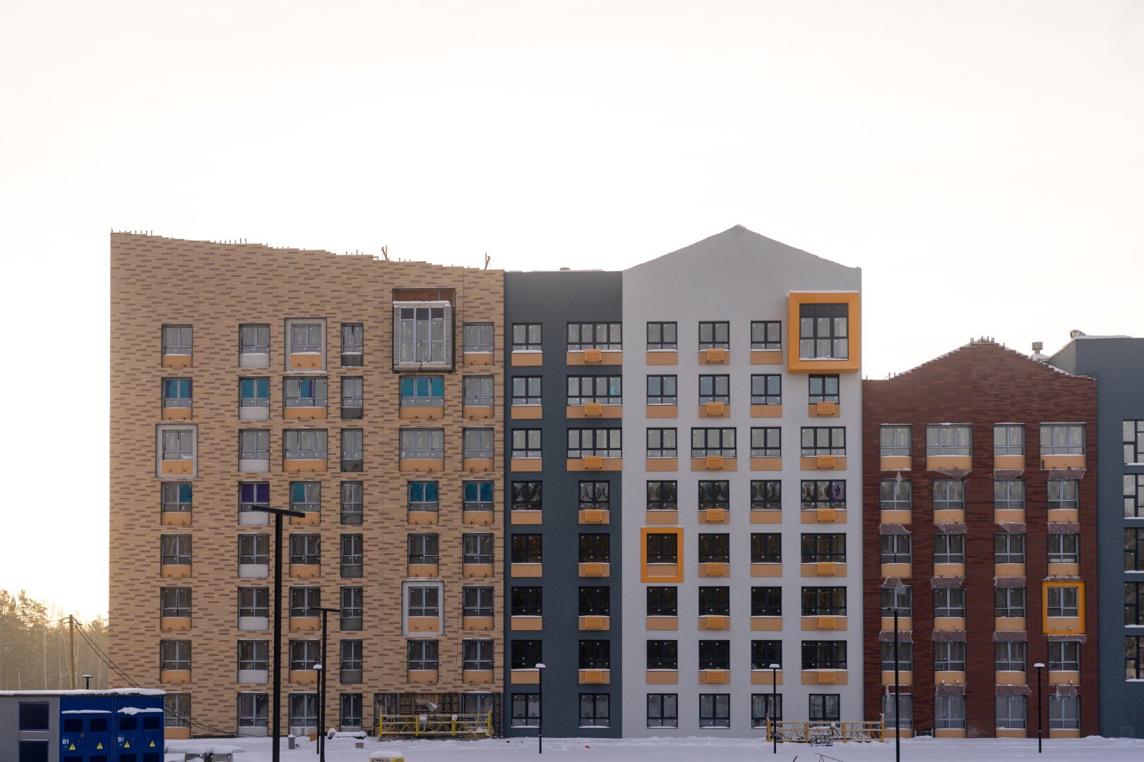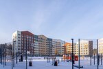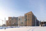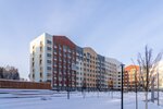 Авторская, индивидуальная архитектура каждой очереди. Сочетание штукатурного и вентилируемого фасадов с имитацией кирпичной кладки и вставок из деревянных материалов.
