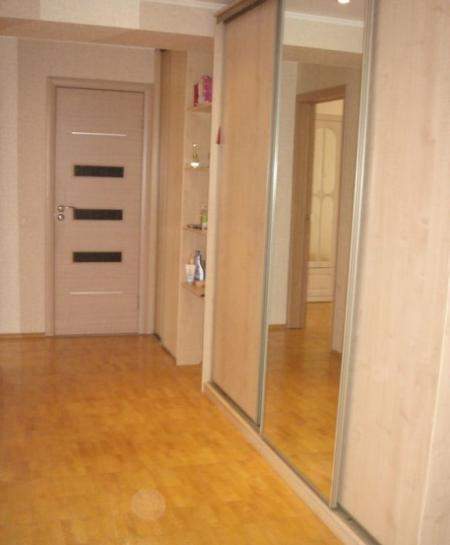 В коридоре установлен большой шкаф для вещей, зеркало, пуф.