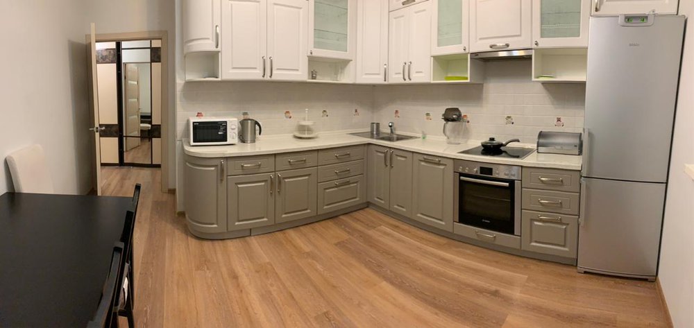 - Бытовая техника: посудомоечная машина, варочная панель, чайник, духовой шкаф, вытяжка, холодильник, стиральная машина, телевизор.