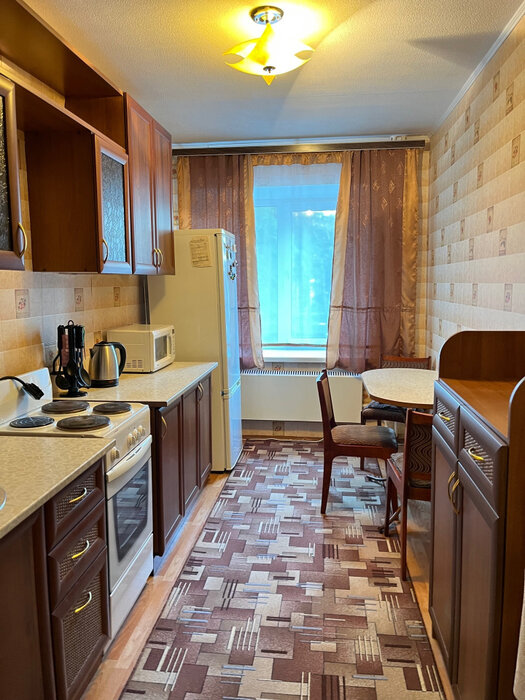 В квартире выполнен ремонт - обои, натяжной потолок, ламинат. Естт кухонный гарнитур с раковиной и смесителем, варочная поверхность, холодильник, обеденный стол, стулья, кровать, тумбы, диван, 2 кресла, журнальный стол. Во всех комнатах есть гардины. В квартиру проведен интернет и ТВ Билайн. Во дворе есть детская площадка, парковка для машин. Инфраструктура - в шаговой доступности детские сады, школа, продуктовые магазины, кафе, остановки общественного транспорта, с которых можно без проблем уехать в любой район города. Также недалеко ТРЦ Глобус. До метро на автобусе 10 минут. ID объекта в нашей базе: 10238