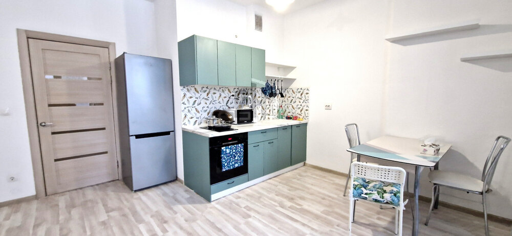 Есть все необходимое для жизни – кухонный гарнитур, холодильник, микроволновая печь, чайник, стиральная машинка, телевизор, стол, диван, посуда, даже новые свежие полотенца.