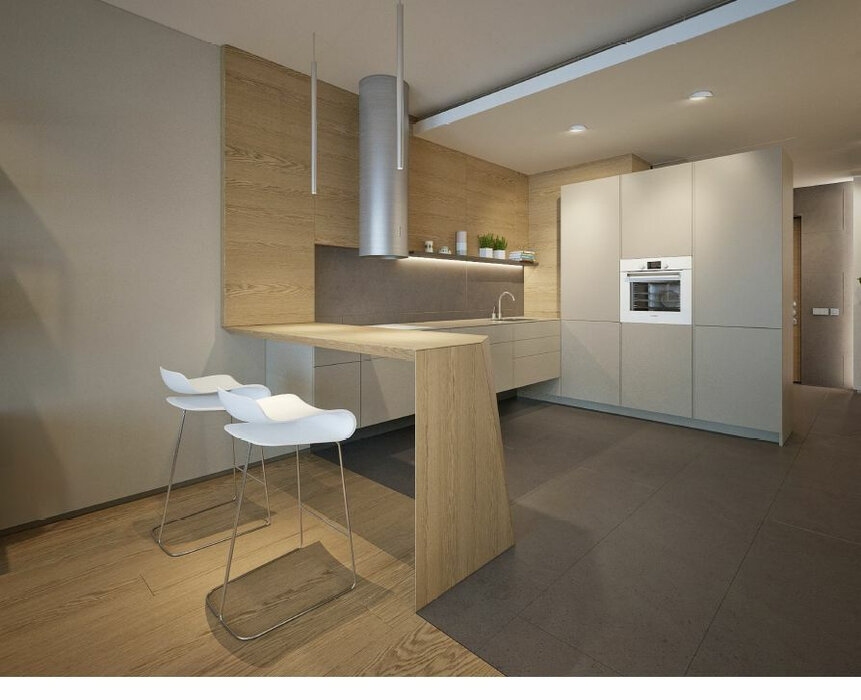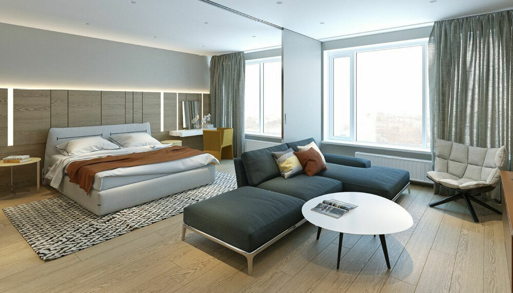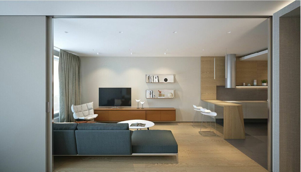 Интерьер выполнен в современном стиле, с использованием качественных материалов.