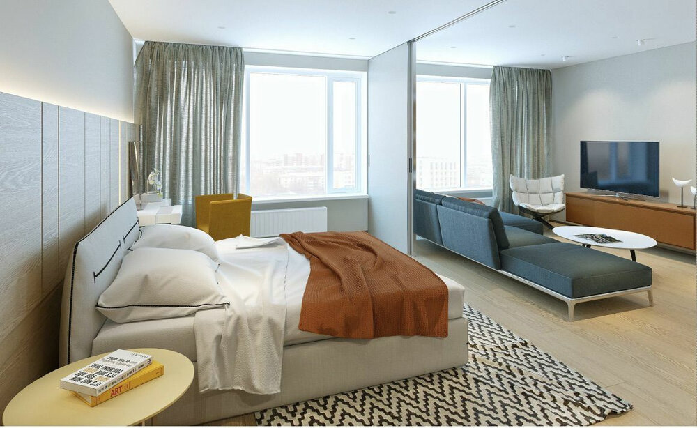Квартира оснащена всем необходимым для комфортного проживания и полностью готова к заселению: кухня оборудована встроенной техникой (варочная поверхность, духовой шкаф, холодильник, микроволновая печь, посудомоечная машина), в ванной установлена стиральная машина, в гостиной ТВ, а в комнатах предусмотрены места для хранения вещей.