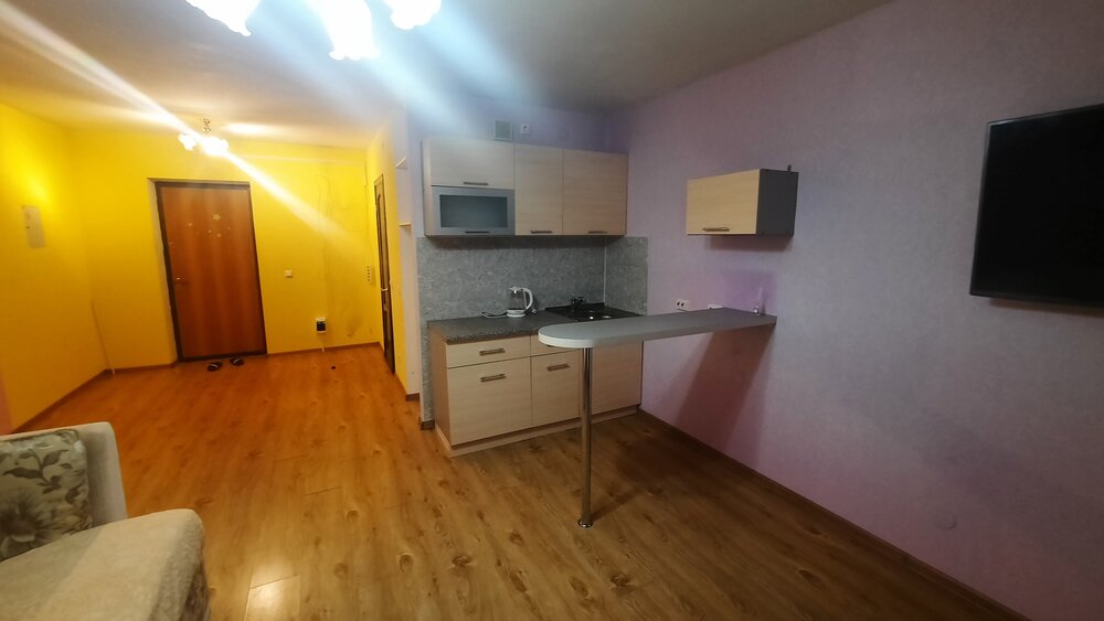 В квартире выполнен ремонт - обои, натяжной потолок, ламинат. Естт кухонный гарнитур с раковиной и смесителем, варочная поверхность, холодильник, обеденный стол, стулья, кровать, тумбы, диван, 2 кресла, журнальный стол.