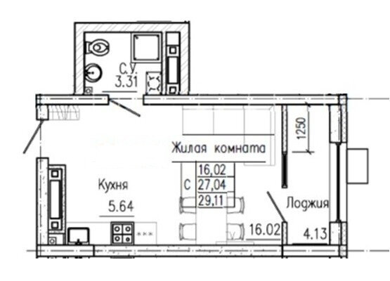 Общая площадь:29 м2