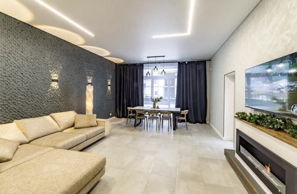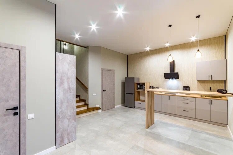 - Просторная современная гостиная с кухней