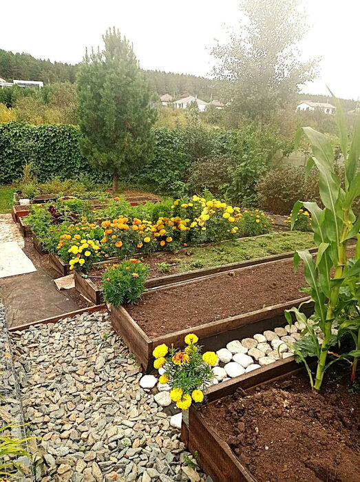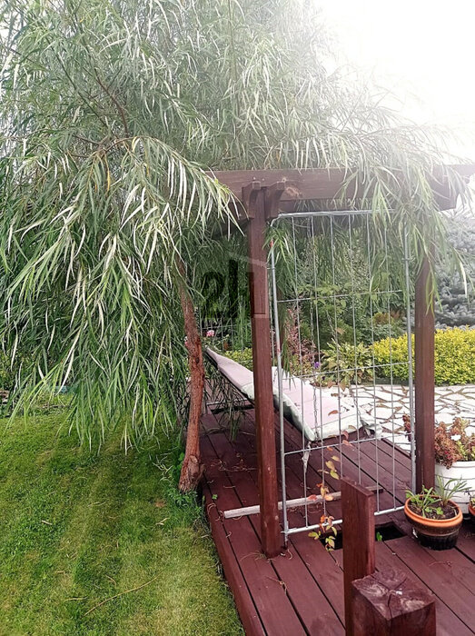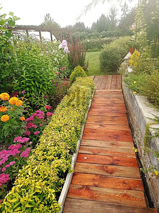 На участке несколько построек – беседки, бытовка, две теплицы. Зона с оборудованной зоной барбекю. Выложены дорожки, несколько лестниц. Элементы ландшафтного дизайна, арки.