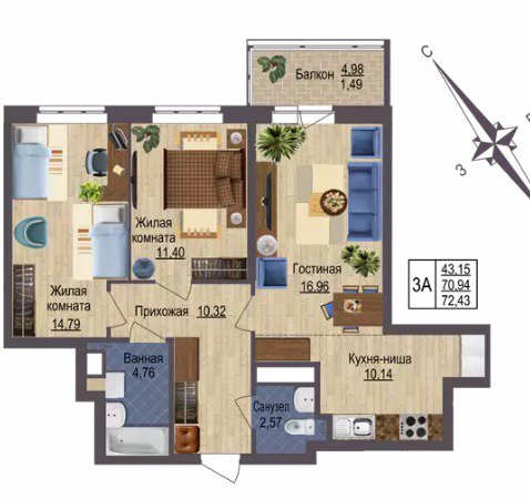 Общая площадь:72.43 м2