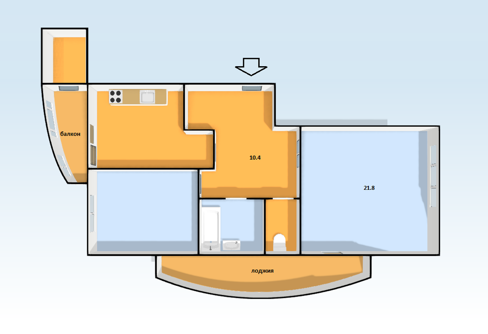 Большая кухня 10 м2 с лоджией и помещением кладовой, комната 21м2 с выходом на вторую лоджию и спальня11 м2. Туалет 2 м2 и ванная комната с окном 4,4 м2. совмещенный. Потолки 2,7 м.