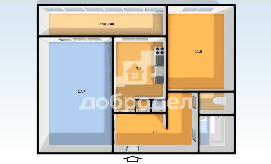 - Очень удобная планировка: кухня 7,4 кв.м — по центру,