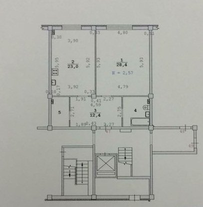 Площадь комнаты- 28,4 м2, площадь кухни-гостиной 23м2. Сейчас квартира используется в качестве офиса, однако ее легко превратить в комфортную евродвушку.