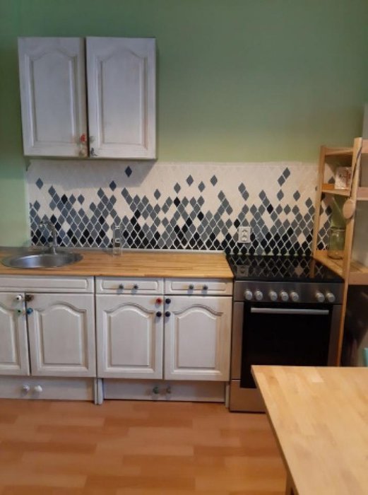 - гарнитур: новый цвет, столешница, раковина и смеситель, яркие ручки.