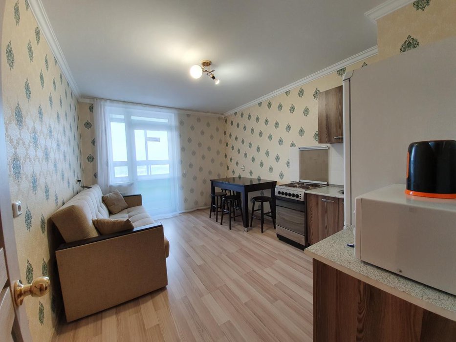 Комната почти 18 м2, на полу ламинат, на стенах обои. Ровный потолок. Кухня просторная, 12 м2, с выходом на лоджию.