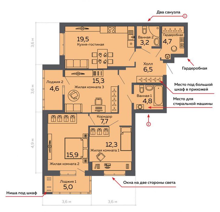 Количество комнат:3