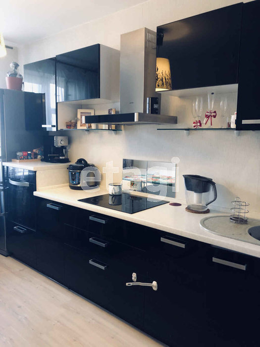 В кухне остается современный кухонный гарнитур со встроенной техникой Gorenje – варочная поверхность, вытяжка, духовой шкаф. В шкафах и ящиках установлены немецкие системы и доводчики BLUM.