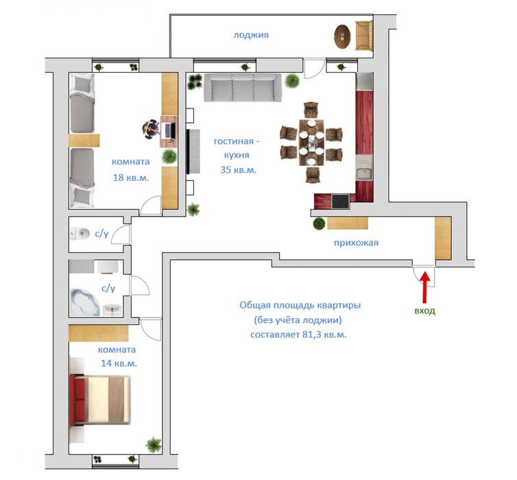 Общая площадь квартиры составляет 81,3 кв.м. Просторная гостиная объединена с кухней в единое пространство площадью 29 кв.м. и две жилых комнаты по 14 и 16 кв.м. Туалет и ванная раздельные. В квартире произведен качественный ремонт. В подарок покупателю остается встроенный шкаф-купе в прихожей и качественный кухонный гарнитур с техникой BOСSH. Окна выходят во двор и на улицу. На всех окнах установлены пластиковые стеклопакеты, лоджия застеклена.