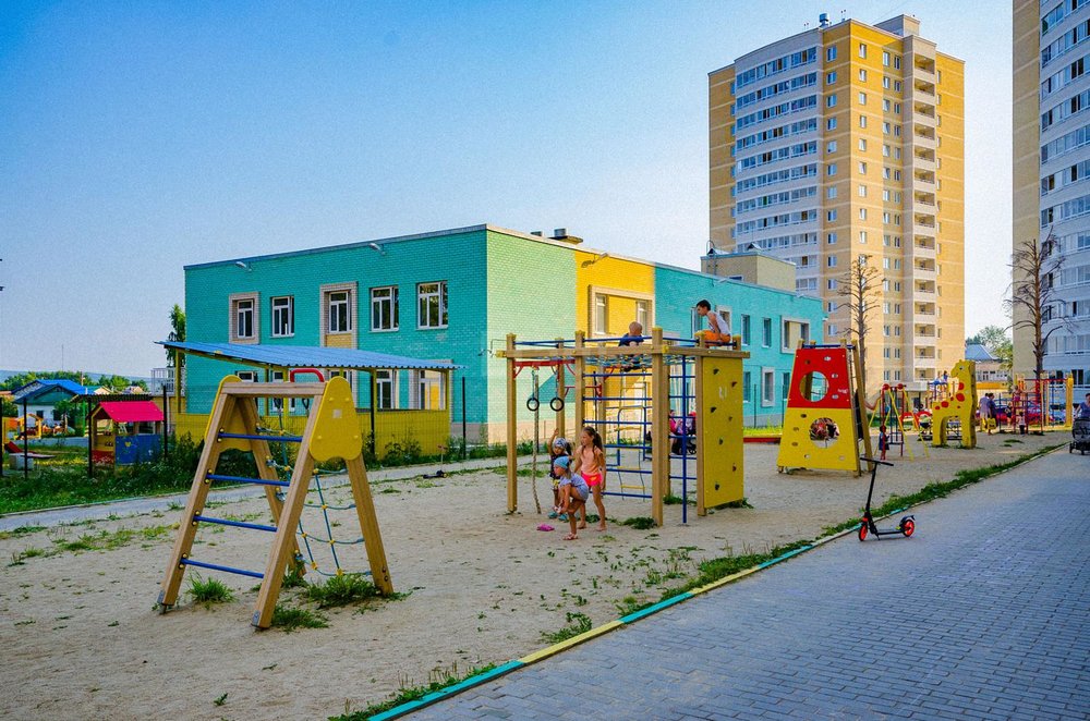 Рядом много садиков, во дворе дома один из них, также несколько школ, одну будут ремонтировать.