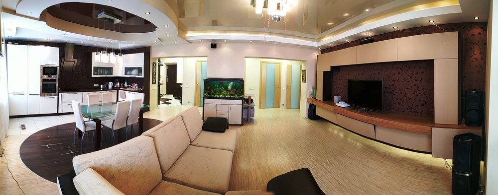 Простор и свобода за счет объединения зала и кухни. Светлая – нет соседей в окнах, не нужны шторы. Днем прямых солнечных лучей нет - в квартире не жарко.
