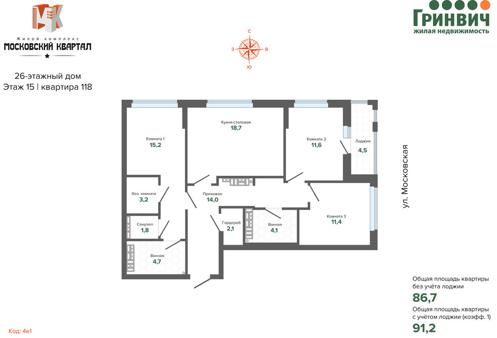 Продажа квартиры: Екатеринбург, ул. Московская, 192, ЖК "Московский квартал 2" (Гринвич) (Московская, 192) (Юго-Западный)
