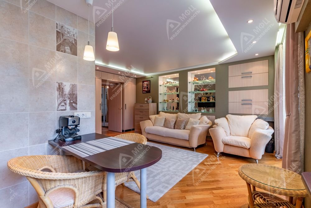 На полу - натуральная паркетная доска, в санузле и на кухне - итальянская керамическая плитка и мебель, а также импортная сантехника (унитаз с инсталляцией) и смесители пр-ва Германии и Чехии. В квартире достаточное количество встроенных шкафов, сделанных специально под заказ для этой квартиры. Все сделано с большой любовью и тонким вкусом хозяев: просторная гостиная и уютная спальня с окнами во двор очень располагает к покою и гармонии.