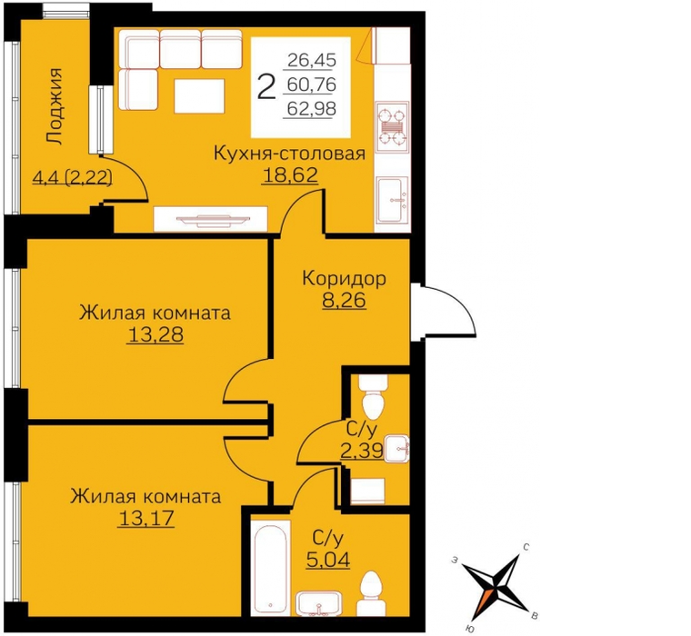 Екатеринбург, ул. Колмогорова, 73 к.3 (Заречный) - фото квартиры 18 сентября 2024 90 дн. 2 59.4 13/18 11 690 000