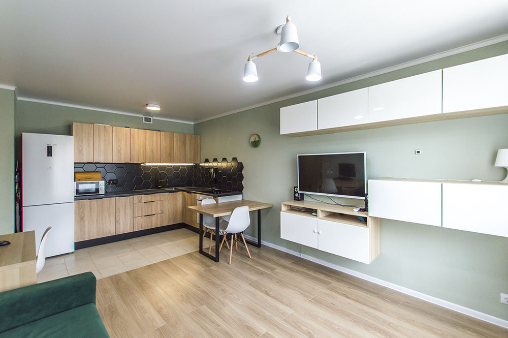 Ищем новых хозяев для нашей уютной квартиры с огромной-кухней гостиной, прекрасным двором, свежим ремонтом. Таких вариантов на рынке мало: все окна увеличенной площади, чтобы в любое время хватало солнечного света, кухня-гостиная площадью больше 20 квадратов с легкостью вмещает и гарнитур, и зону приема пищи, и пространство для приема гостей. Спальня не крохотная, как зачастую бывает в подобных планировках, окна также выходят на восток, предусмотрена ниша для кондиционера.